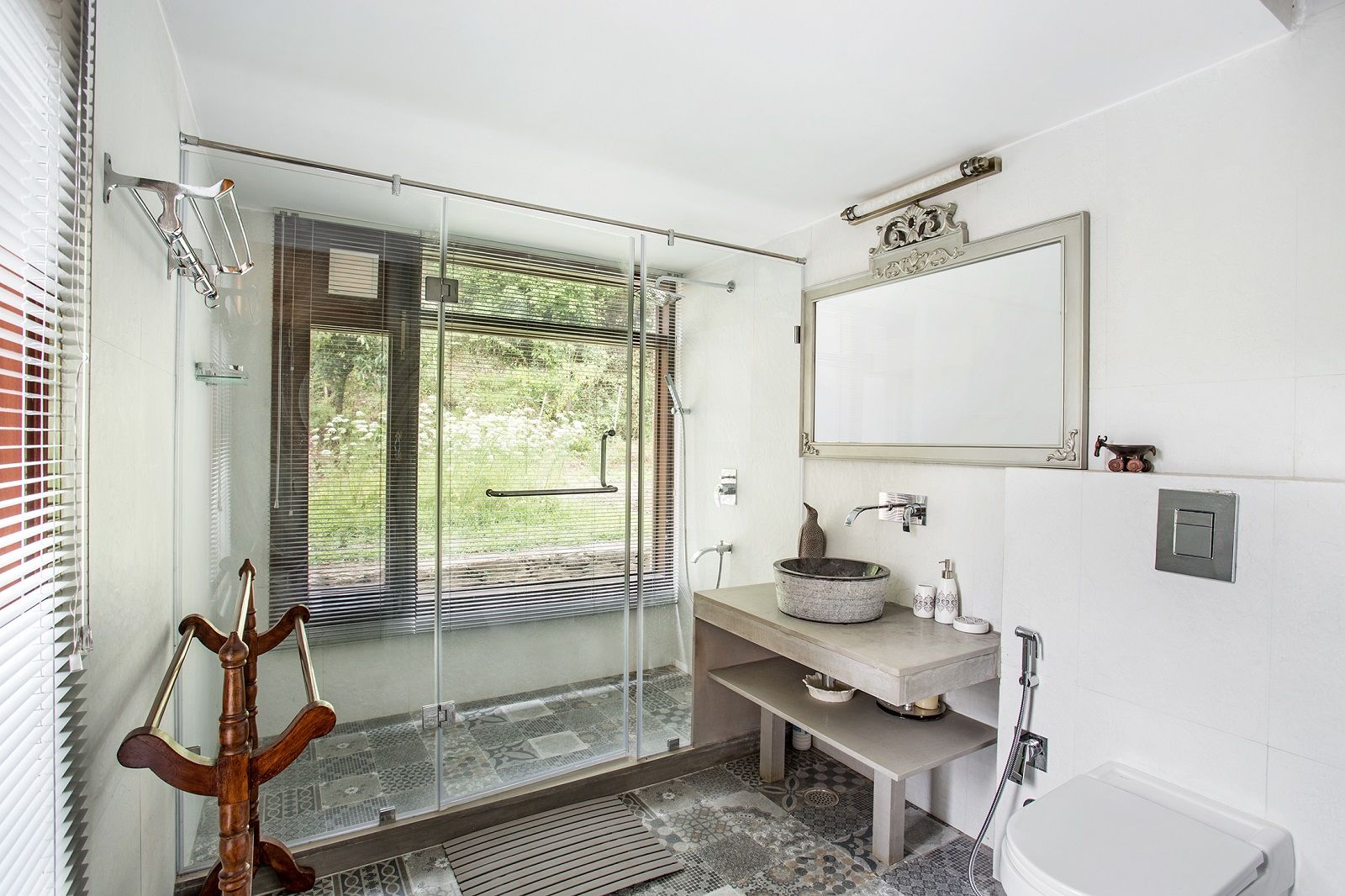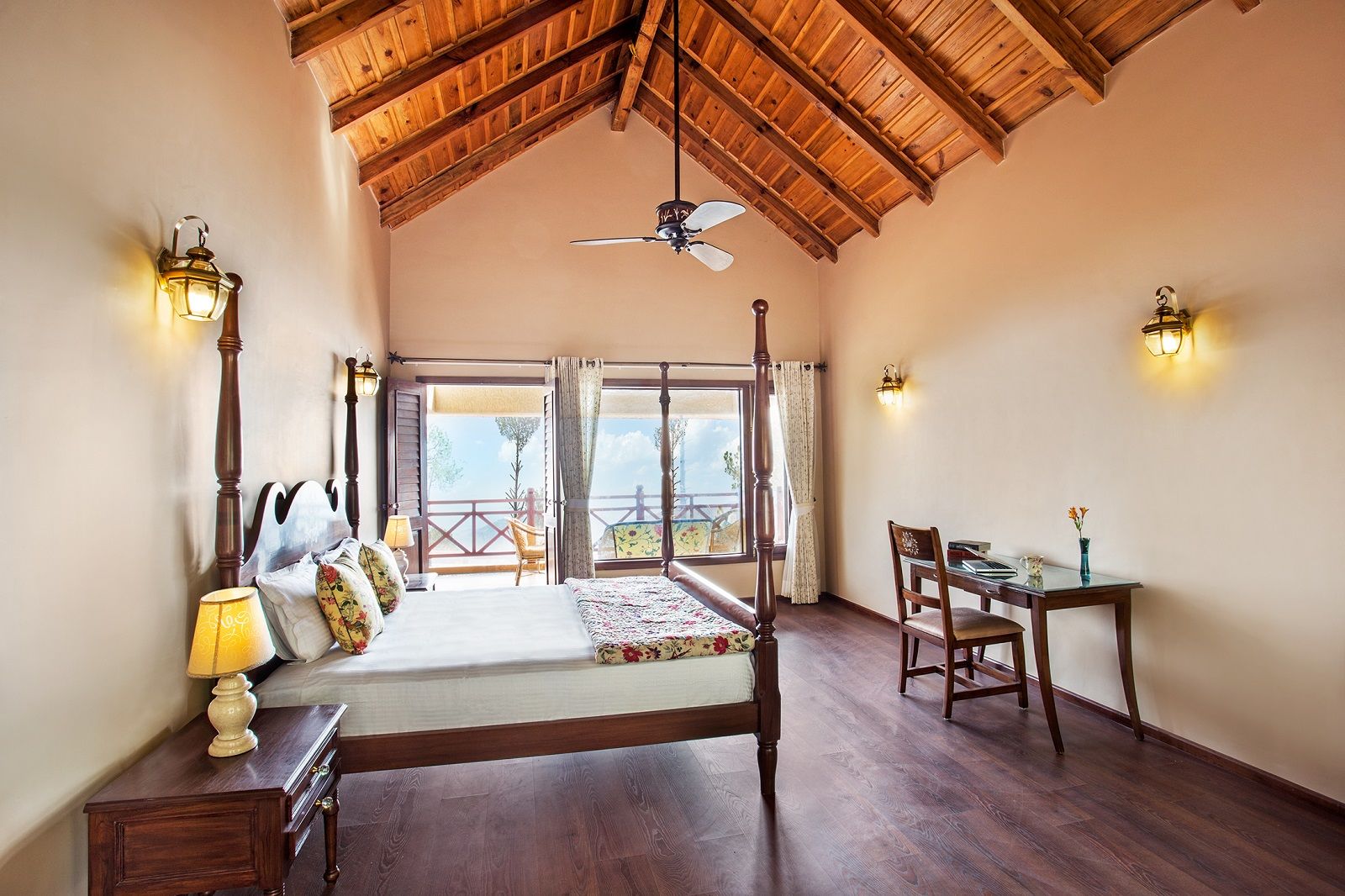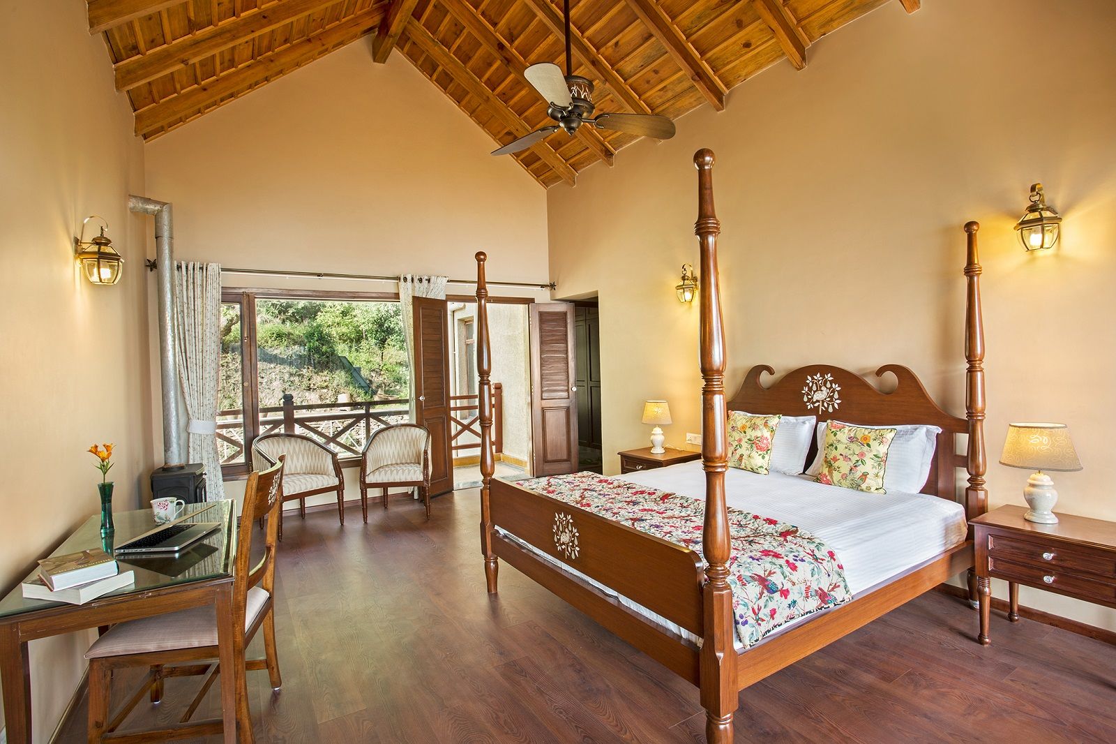 Very large Superking size bed, Flatscreen TV , Extremely spacious room ,Private sit out, Stunning interiors, Sweeping views of the Himalayas. Short flight of stairs to access the living room and gardens.